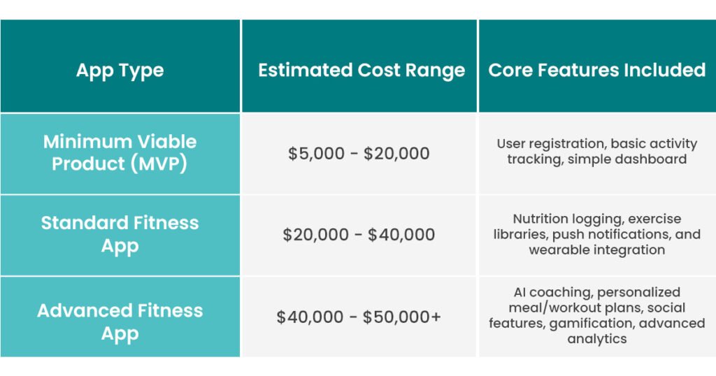 The cost depends on app complexity, platform, and feature set. A simple fitness app may cost $5,000-$20,000, while a fully-featured app like MyFitnessPal with cross-platform support, wearable integration, and premium features can range from $25,000 to $50,000 or more. Ongoing maintenance, updates, and server costs should also be factored in.