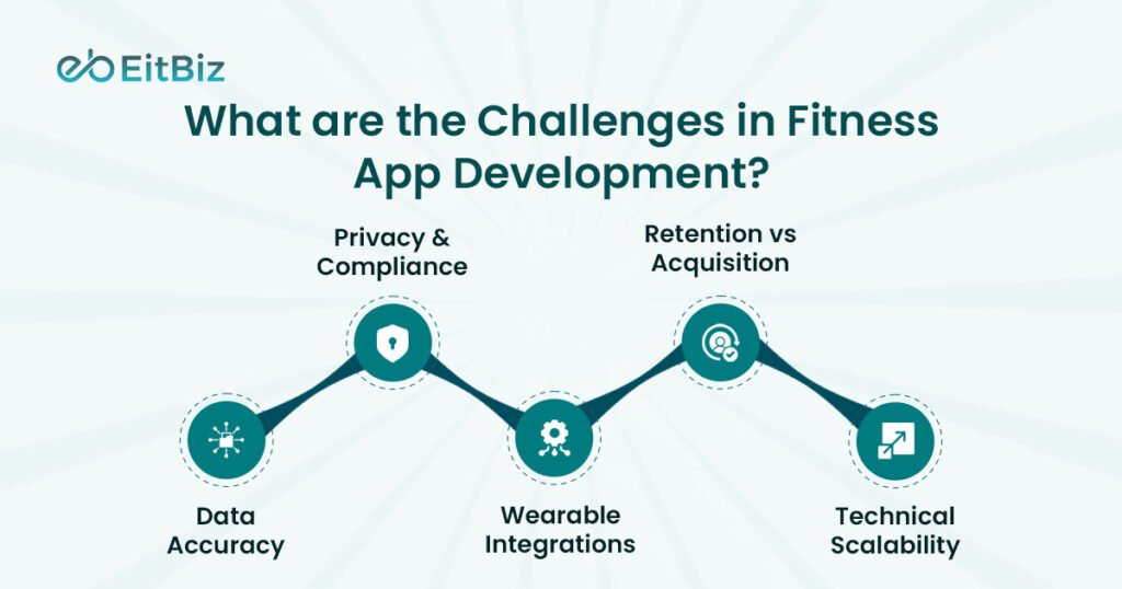 Developing a fitness app comes with several challenges. Ensuring accurate tracking of workouts, calories, and health metrics requires robust integration with devices and wearables. Maintaining user engagement through personalized plans, notifications, and gamification can be complex. Security and privacy are critical, as fitness apps handle sensitive health data. Finally, cross-platform compatibility and scalability add to the development complexity.